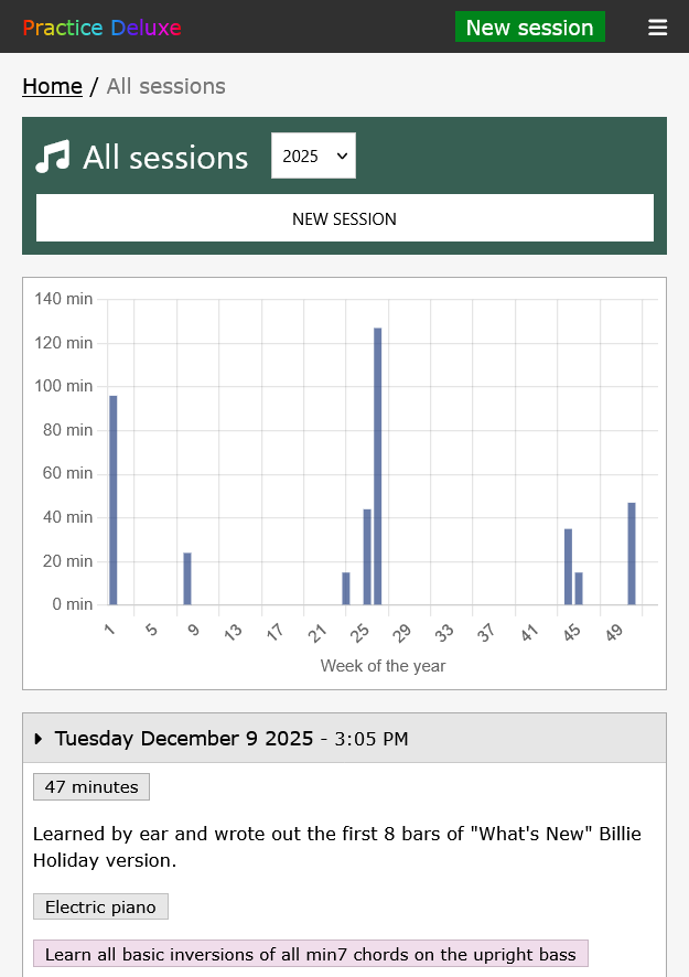 Track your growth as a musician through each practice session - could be 30 minutes a week or 4 hours a day. Tracking