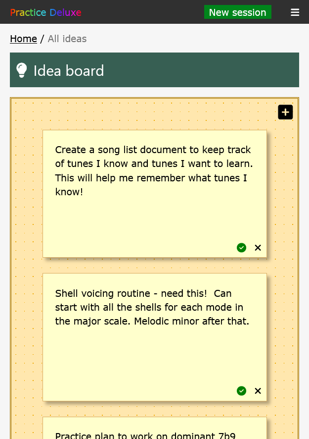 Ideas for future practice sessions can be saved on your own personal idea board.